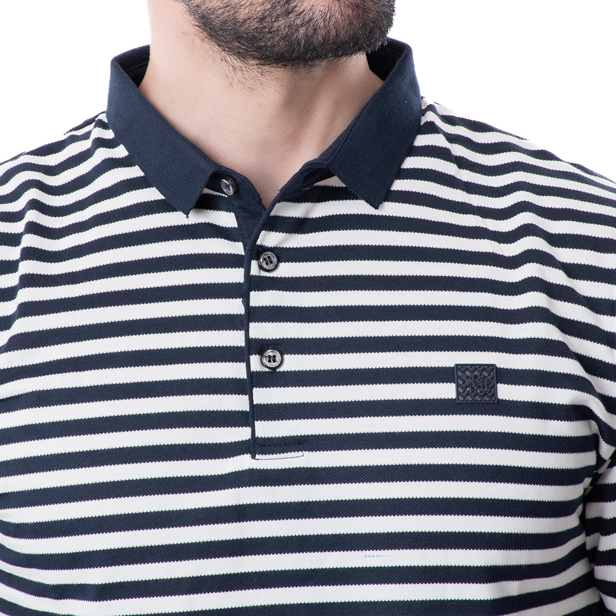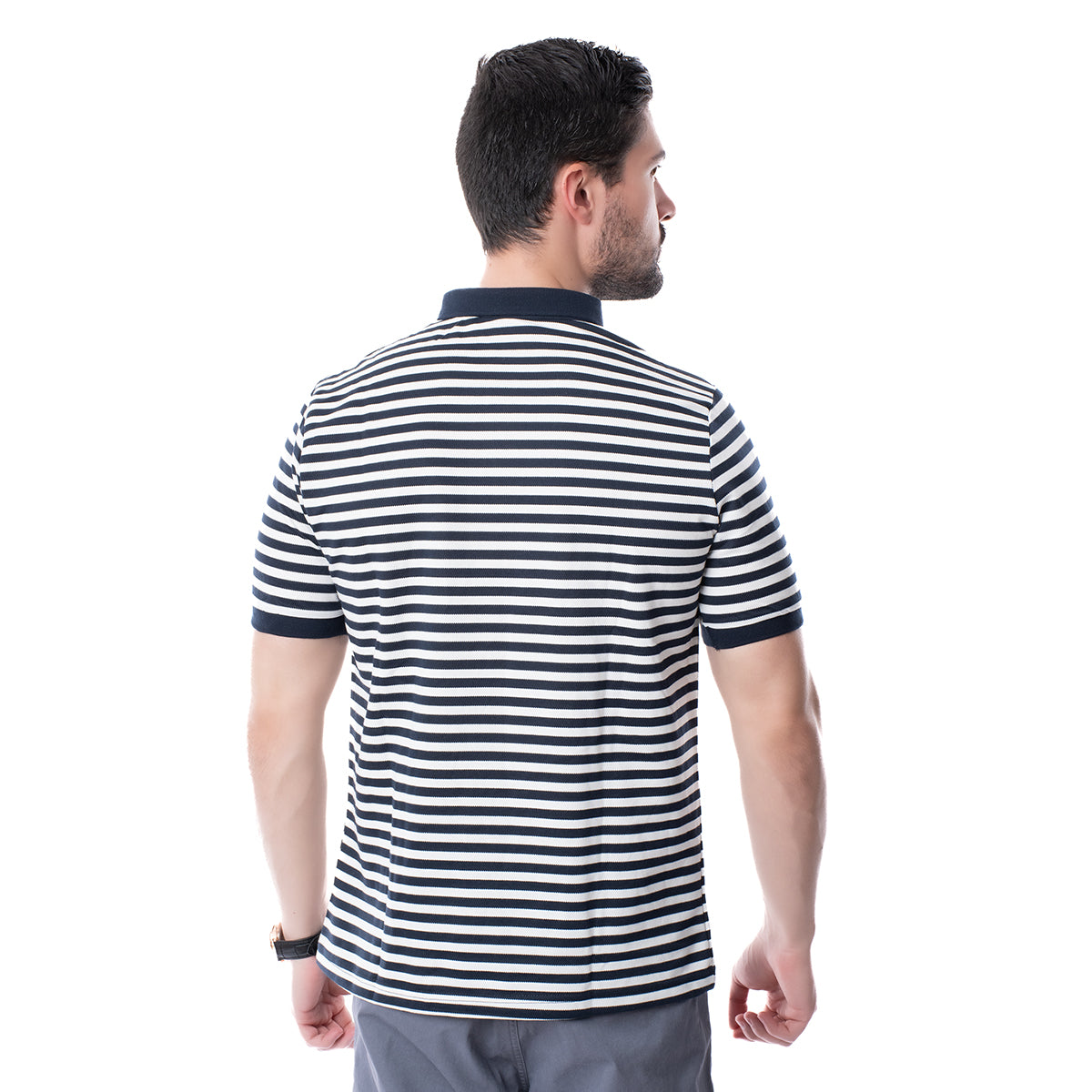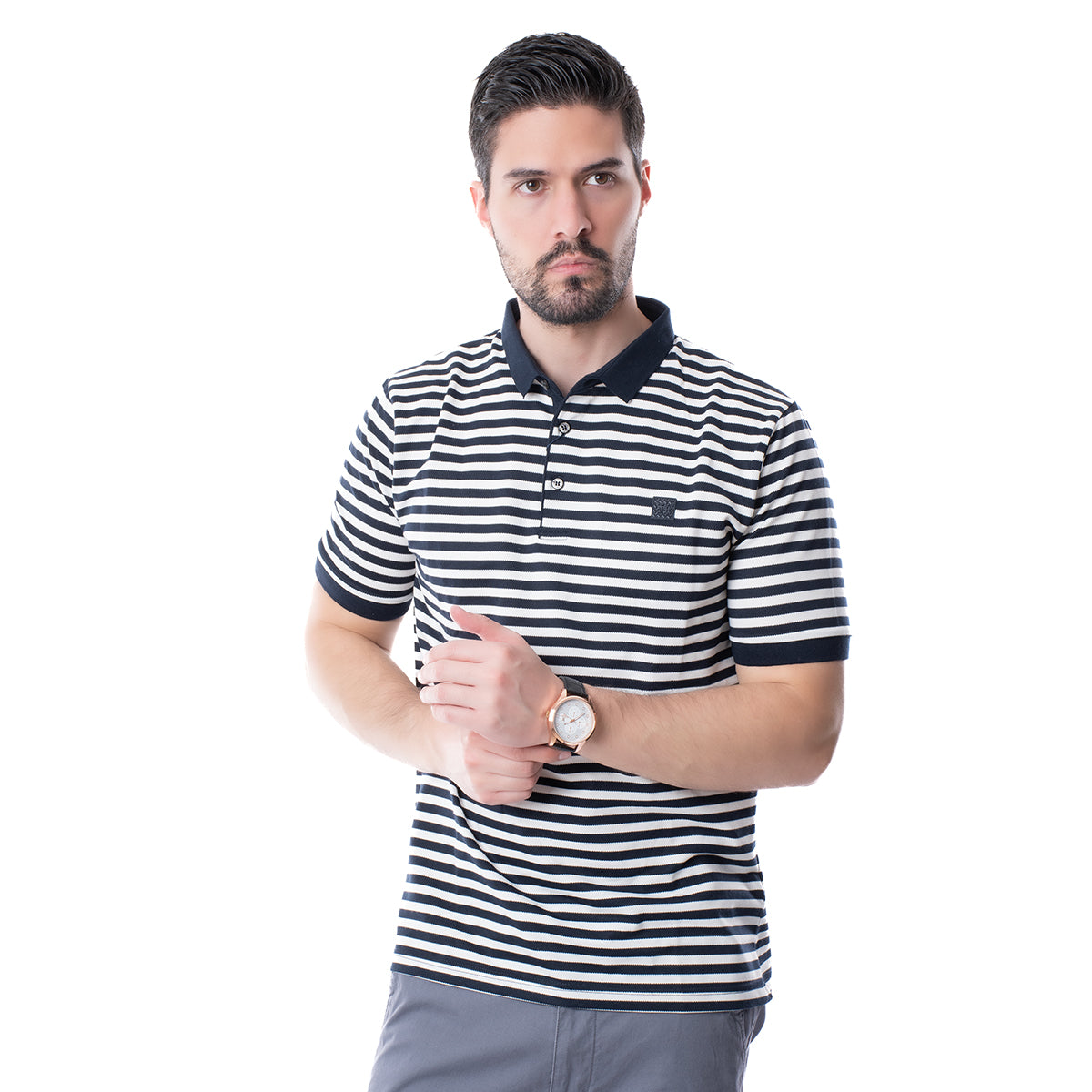 Playera tipo polo de manga corta en color marino con diseño de rayas. Cuello tipo polo con tapeta de botones.