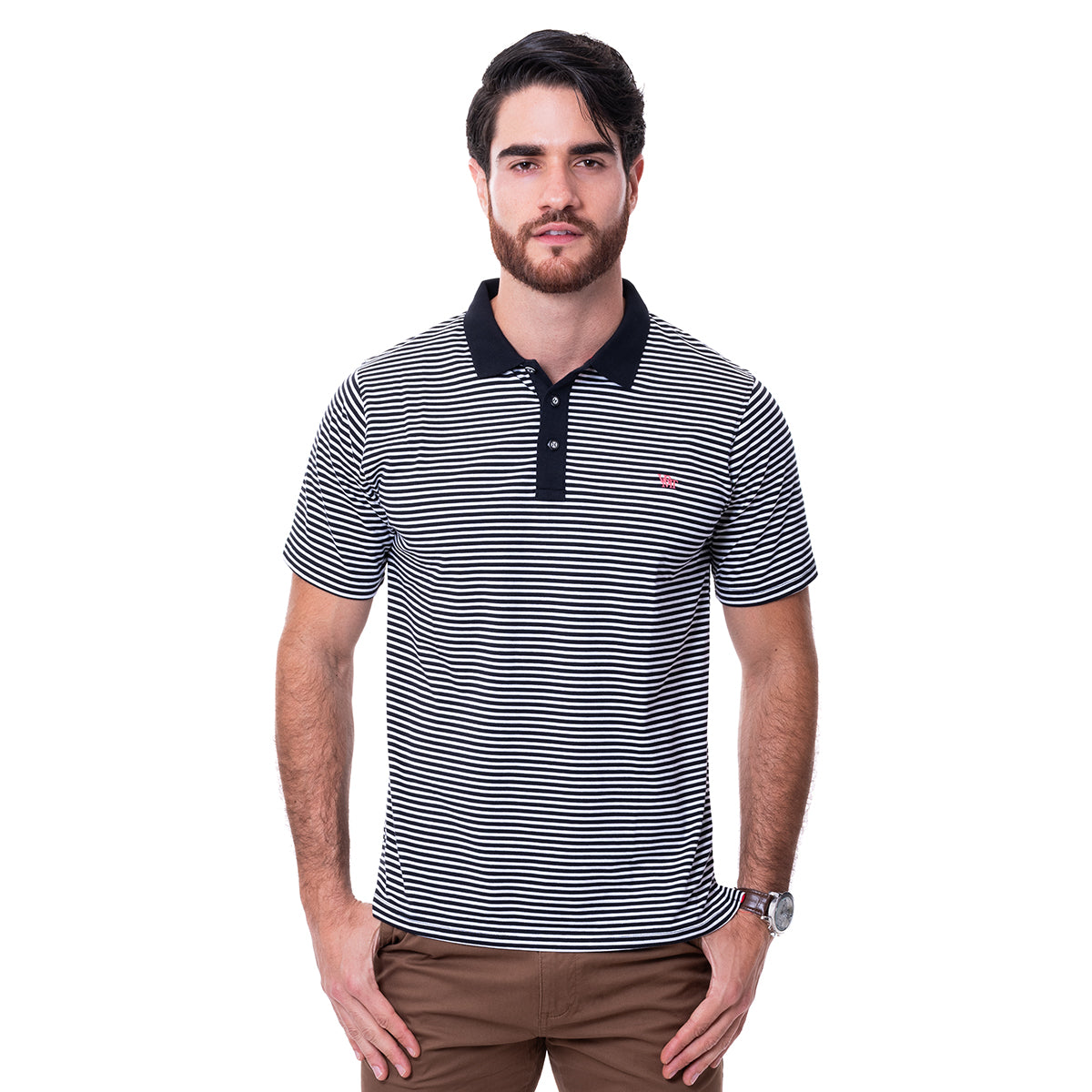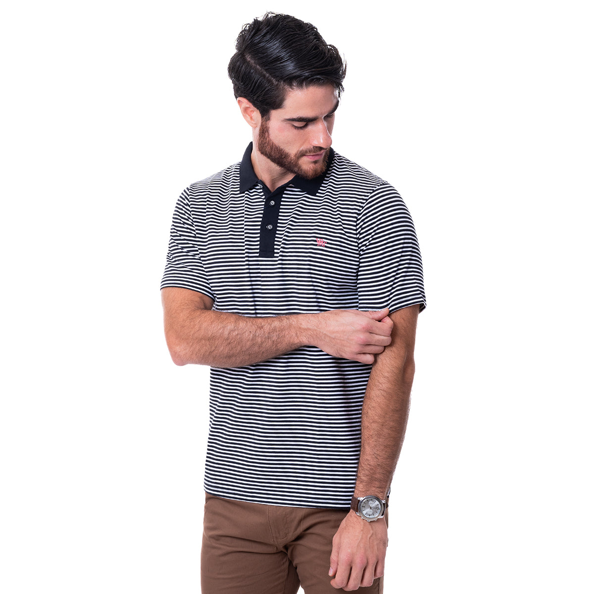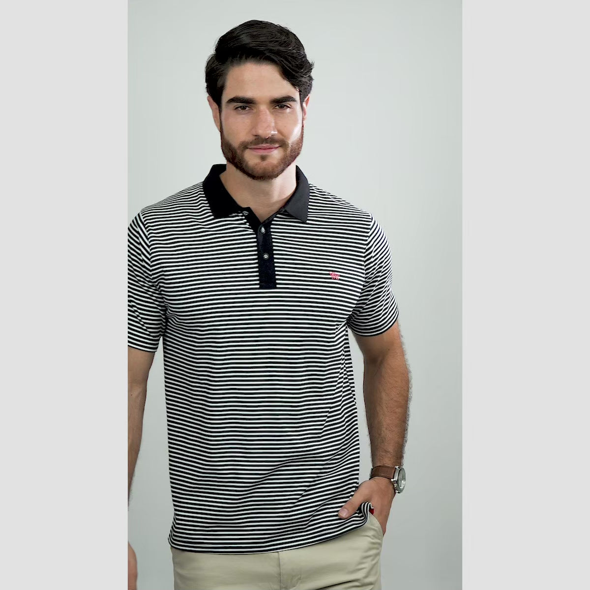 Playera tipo Polo de corte Slim Fit, en color negro, con diseño a rayas . Cuello italiano y manga corta. Moldeable al cuerpo y tela suave. Cierre de botonadura a la altura del pecho.