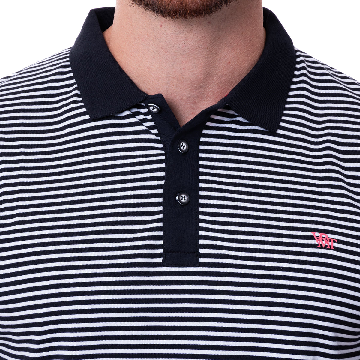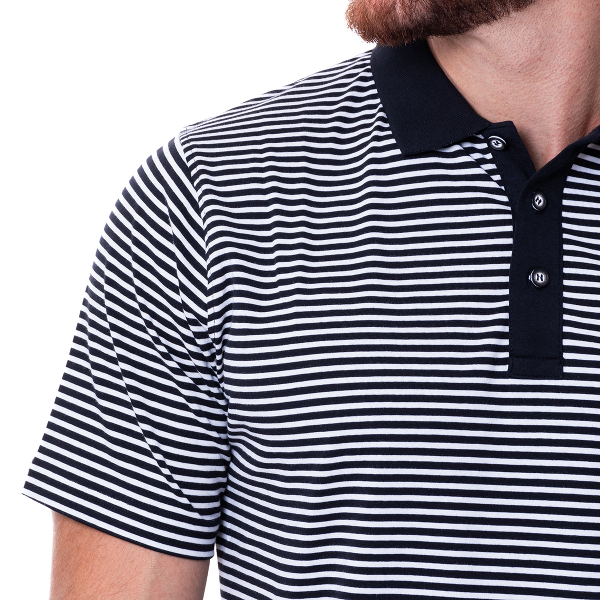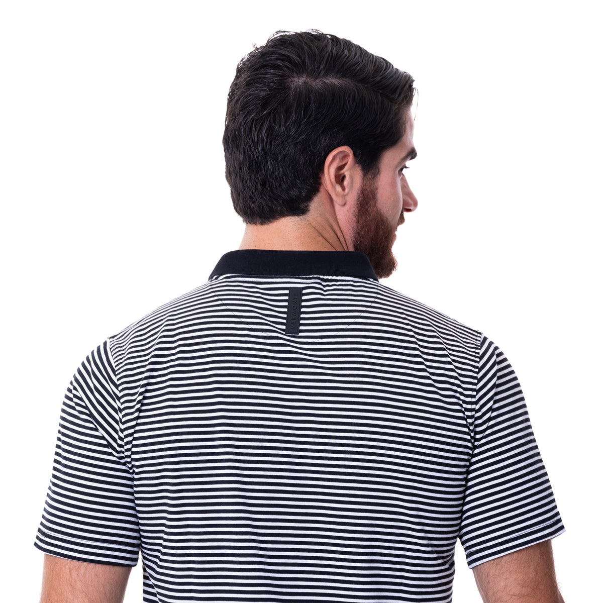 Playera tipo Polo de corte Slim Fit, en color negro, con diseño a rayas . Cuello italiano y manga corta. Moldeable al cuerpo y tela suave. Cierre de botonadura a la altura del pecho.