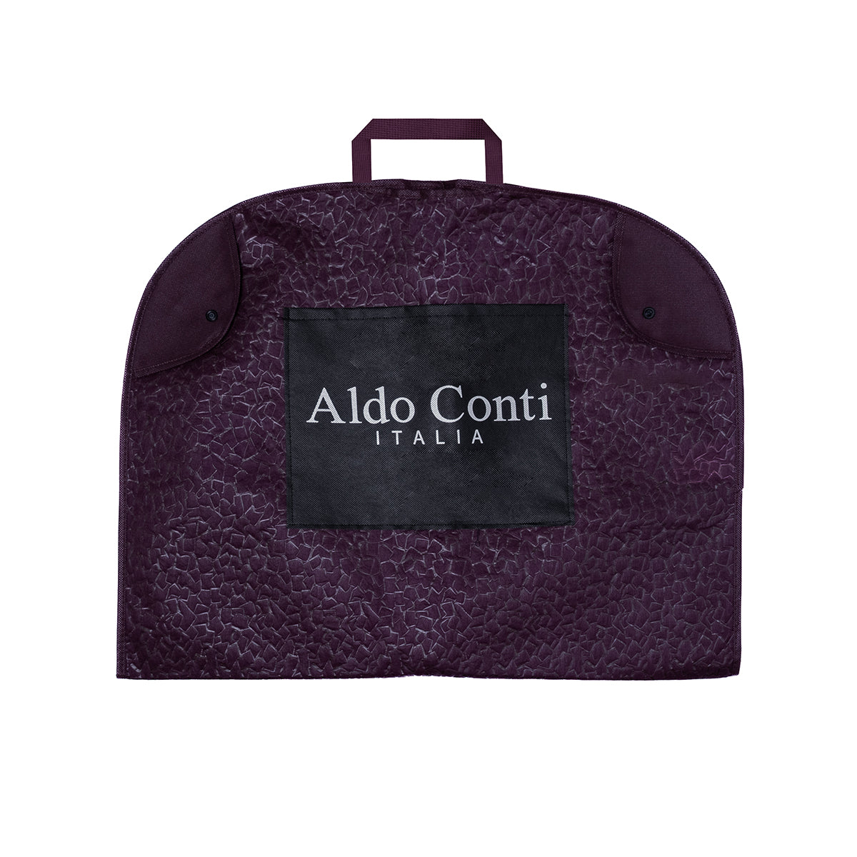 Porta traje color vino con diseño texturizado y bolsillo frontal negro con logotipo Aldo Conti Italia. Incluye asa superior para transporte y botones laterales de cierre. Ideal para proteger tus prendas con estilo durante tus viajes o traslados.