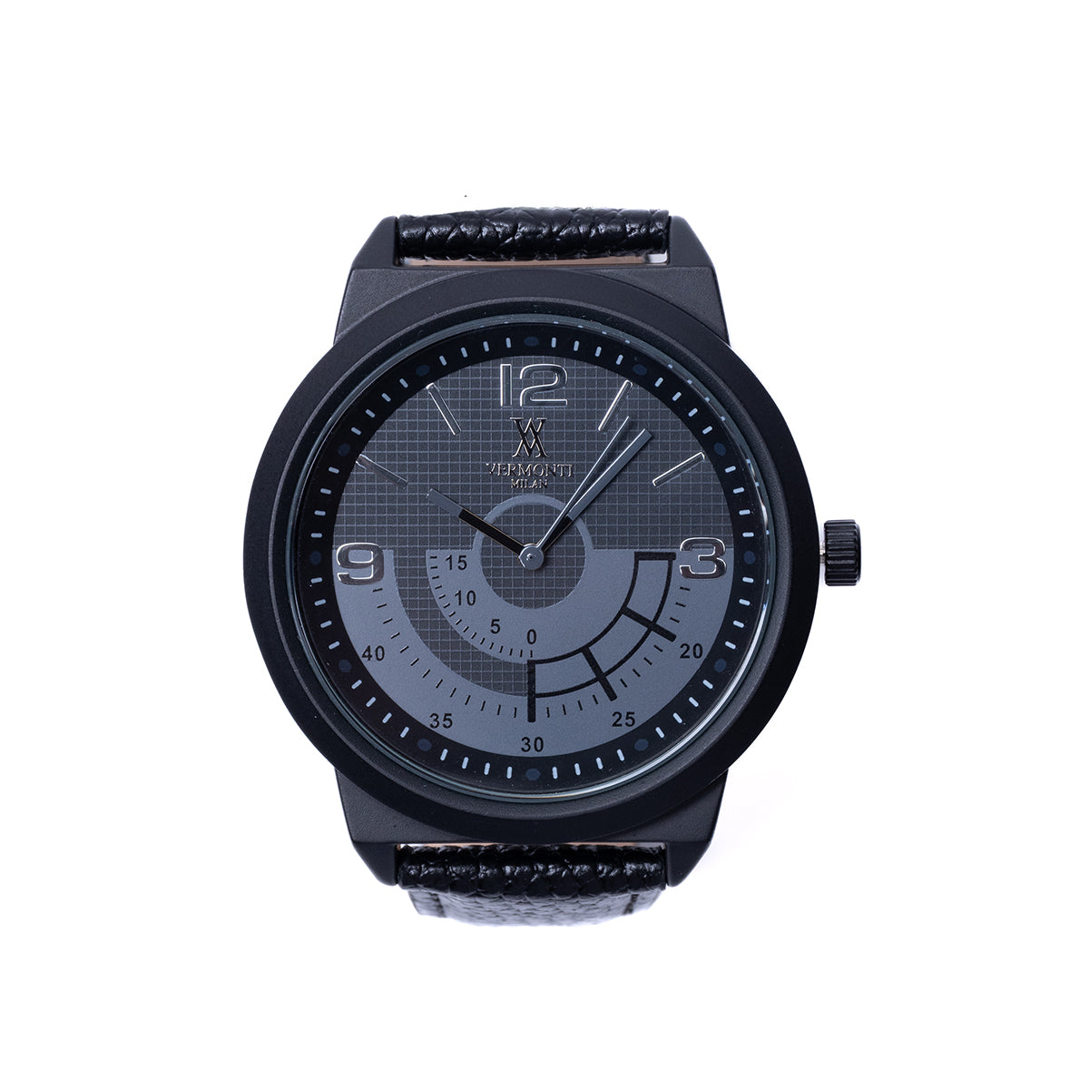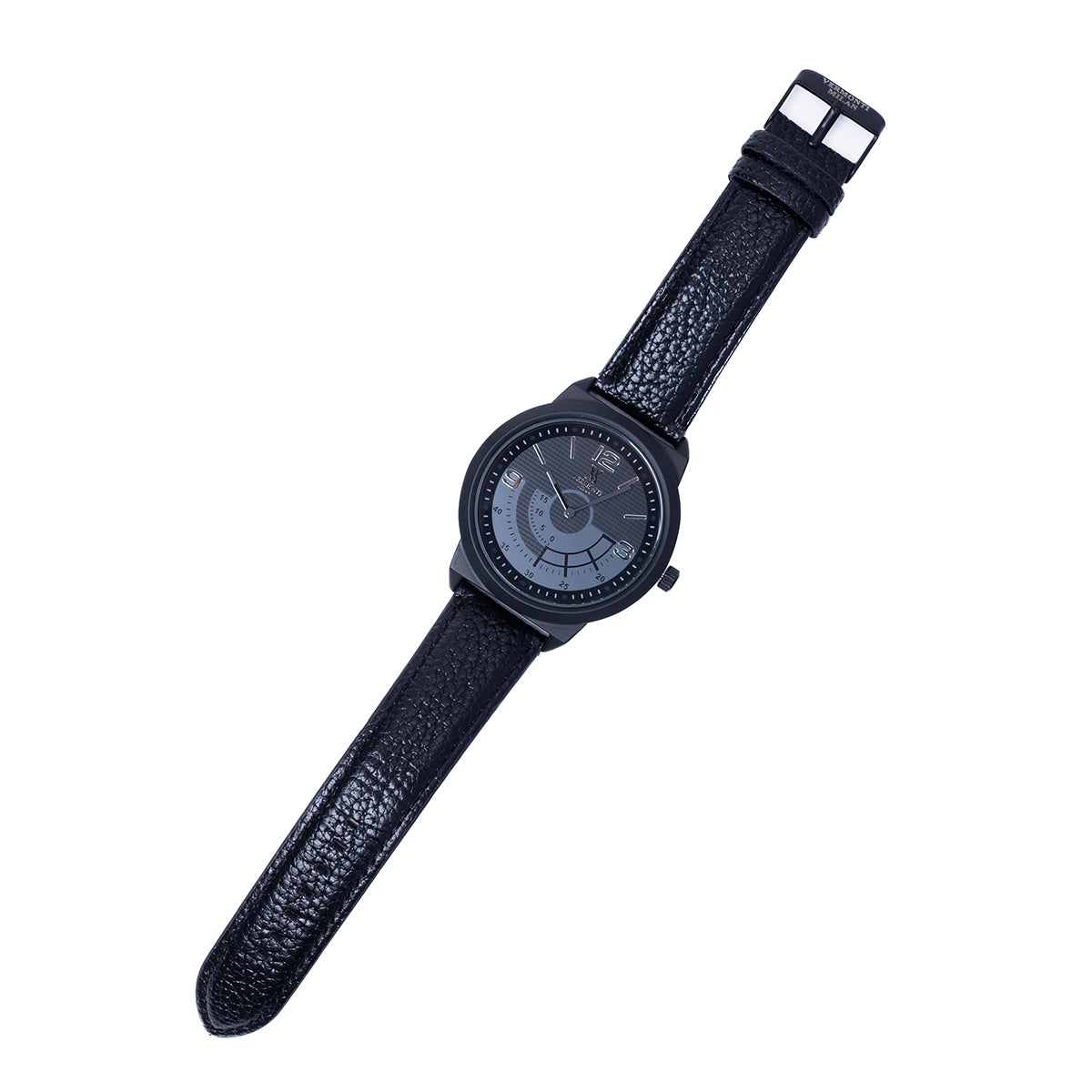 Reloj análogo en color negro con marcadores en relieve lineales y numéricos para fácil lectura. Cuenta con una corona para su configuración.