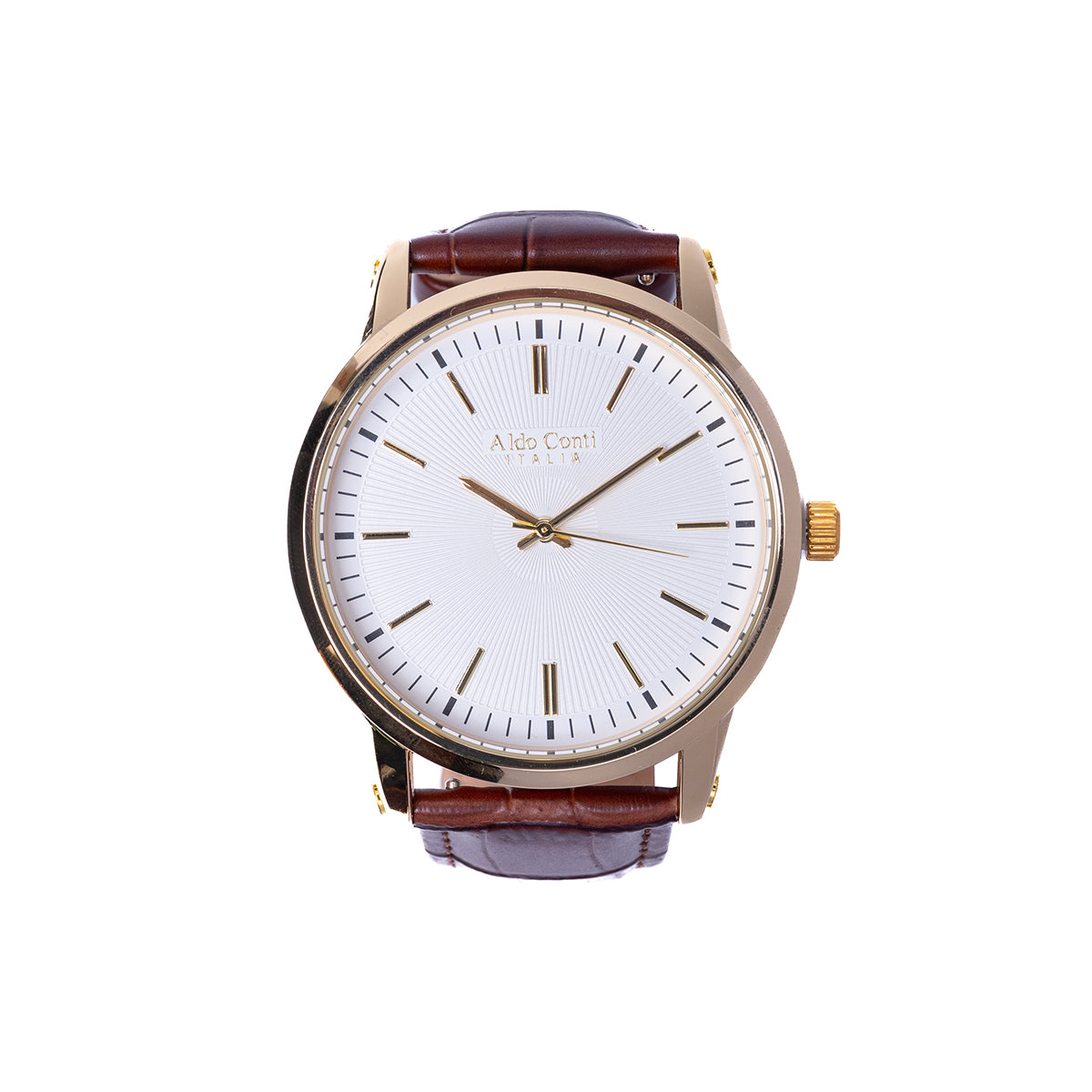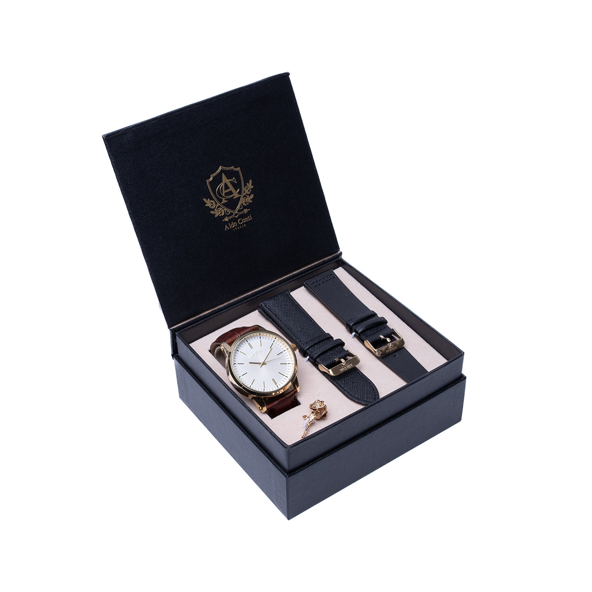 Set de reloj análogo con diseño clásico, carátula lisa y correa tipo piel en color café. El set incluye accesorios visibles: 2 correas intercambiables en color negro para mayor versatilidad.