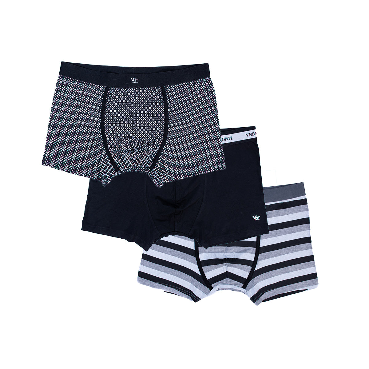 Set de tres piezas de ropa interior tipo bóxer, con elástico en la cintura, moldeable al cuerpo y tela suave. Incluye estuche de viaje. Diseños varios.