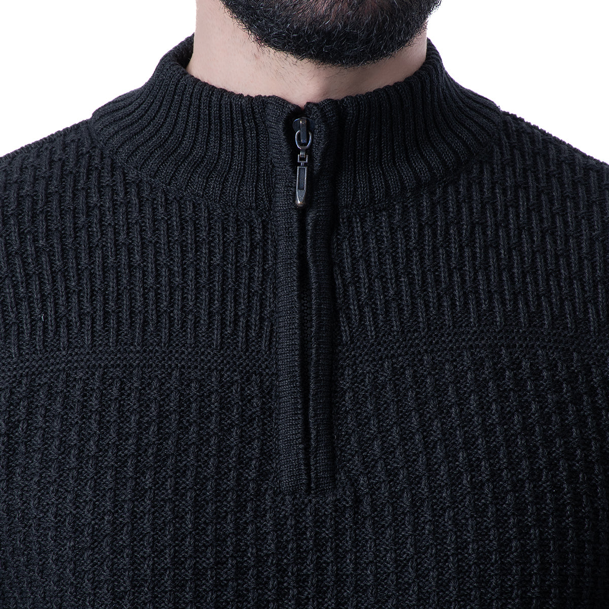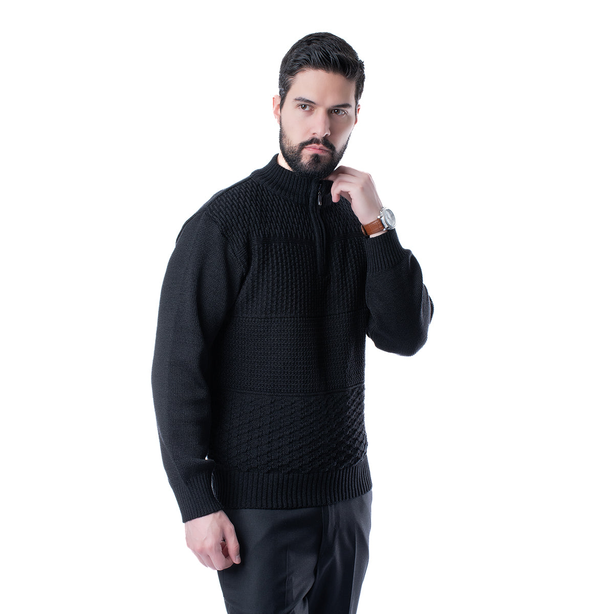 Suéter corte CLASSIC FIT negro con diseño tejido en paneles y cuello con cremallera. Con el corte CLASSIC FIT tendrás un outfit cómodo, conservando el estilo relajado que tanto buscas.