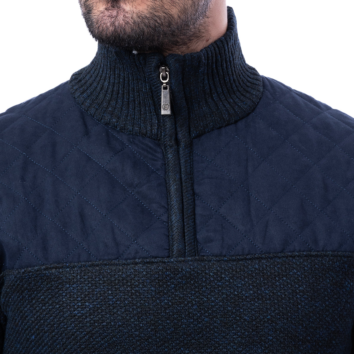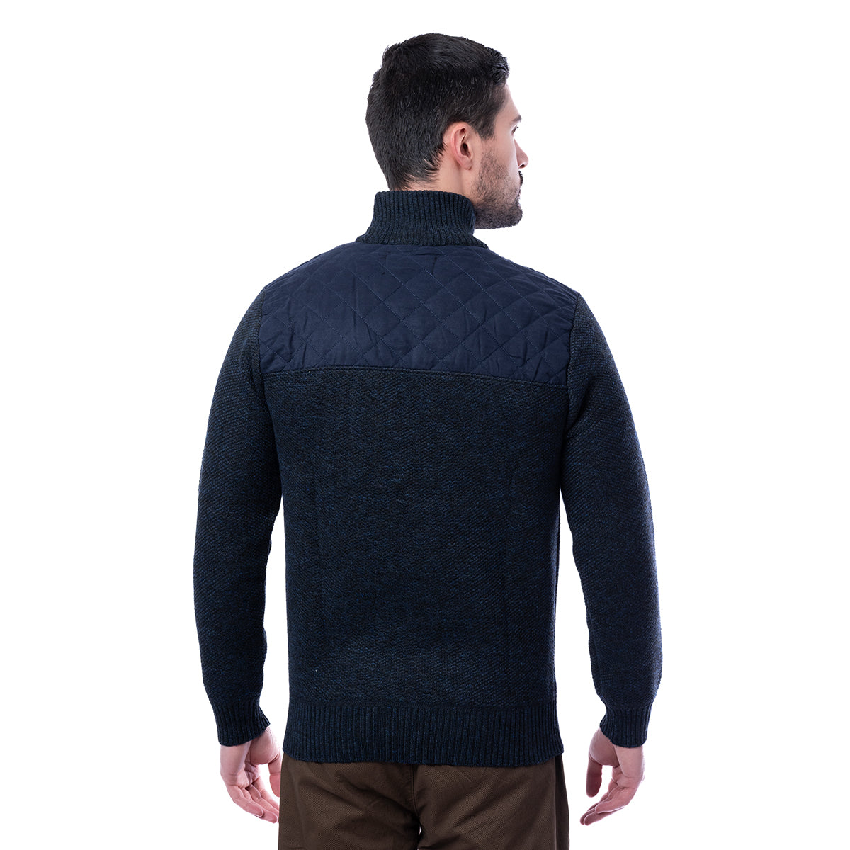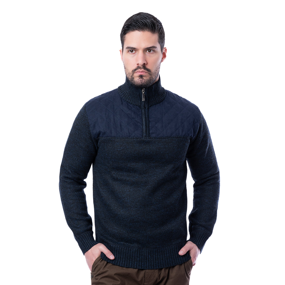 Suéter de color marino, de corte Slim Fit y diseño multicolor en patrón. De Cuello redondo, cierre frontal de cremallera a la altura del pecho.