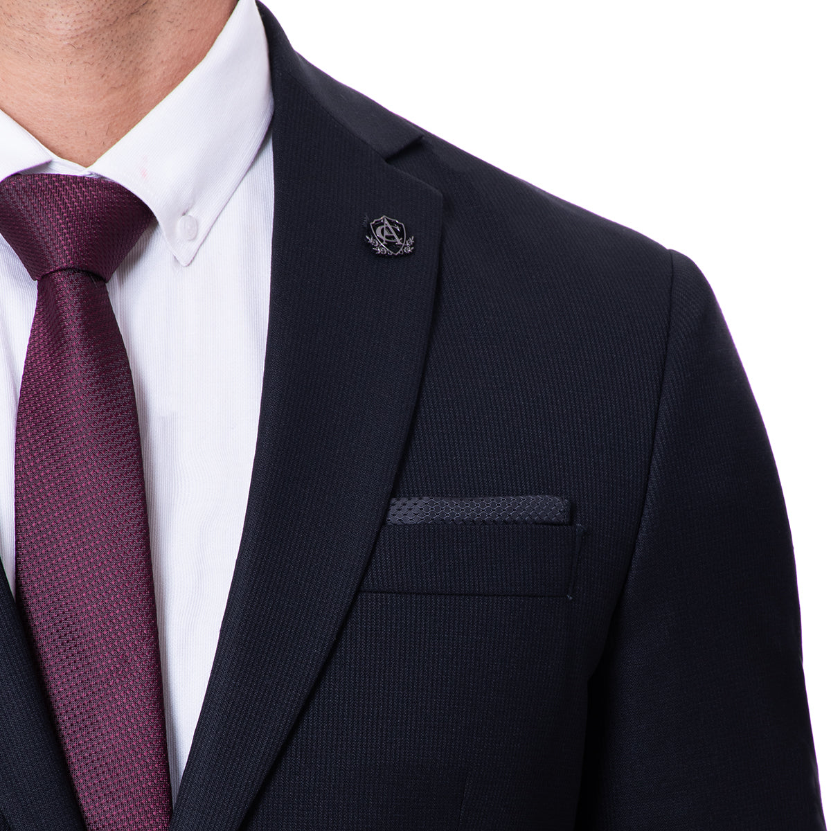 -Saco con solapa de muesca, recto de dos botones, bolsillo superior de lado izquierdo para pañuelo y dos bolsillos con tapa de cartera en costados. Pin extraíble.