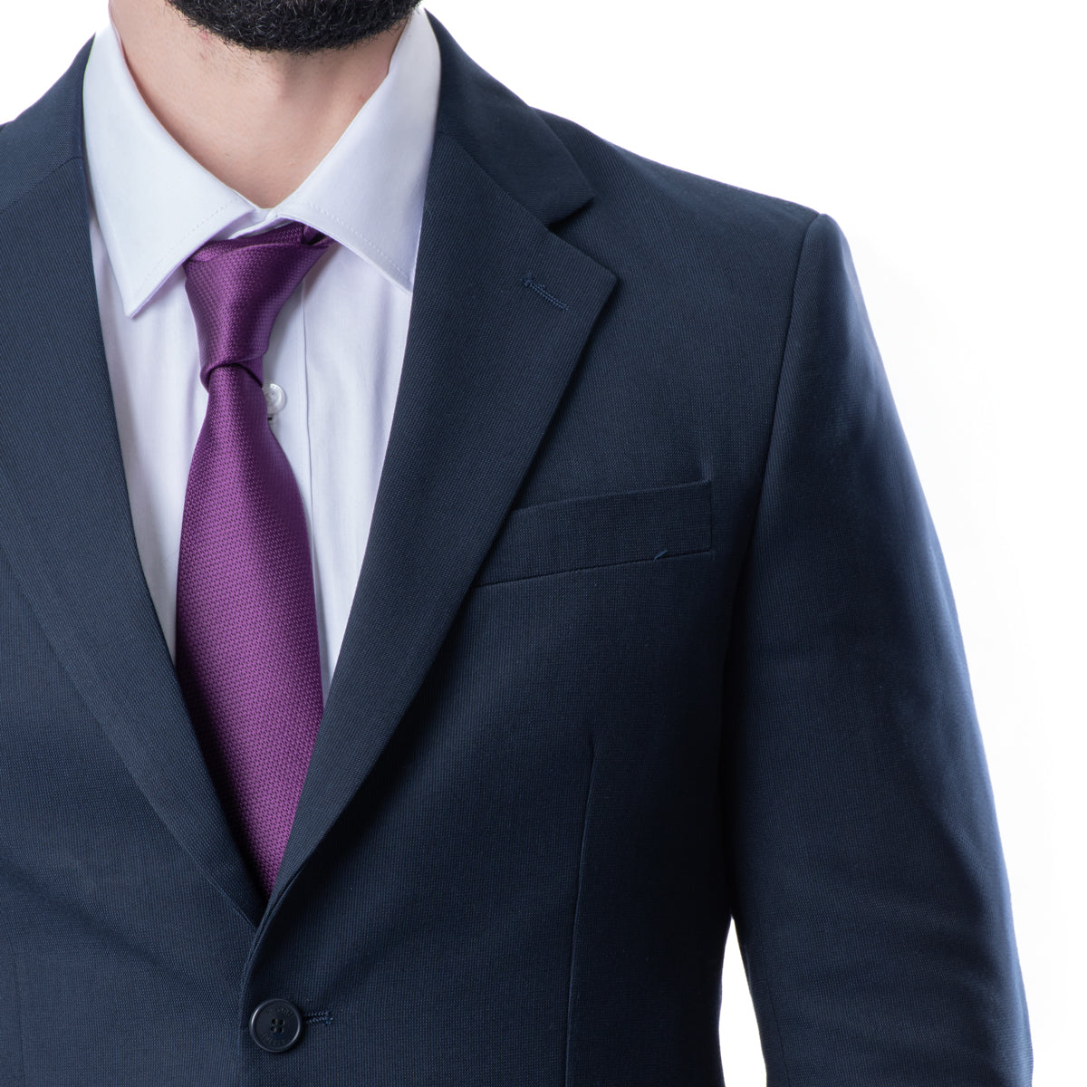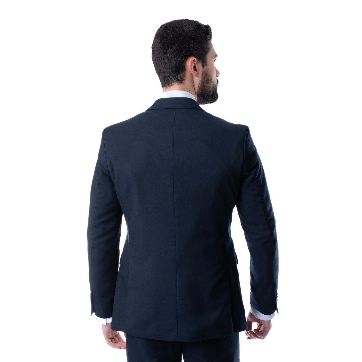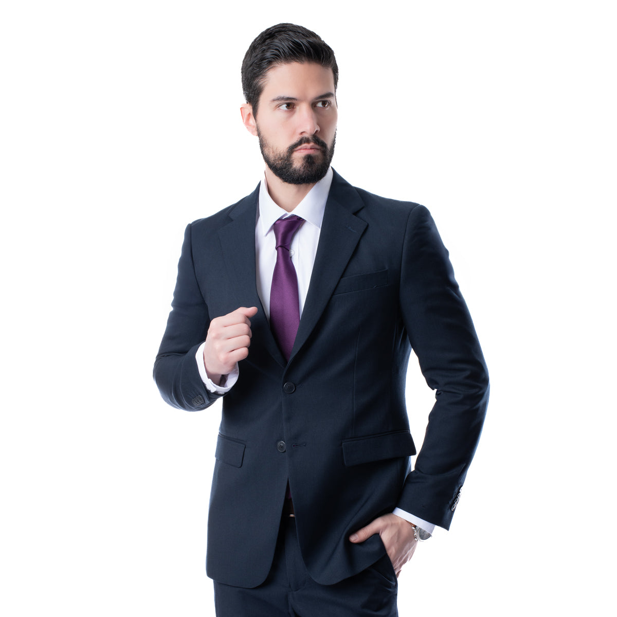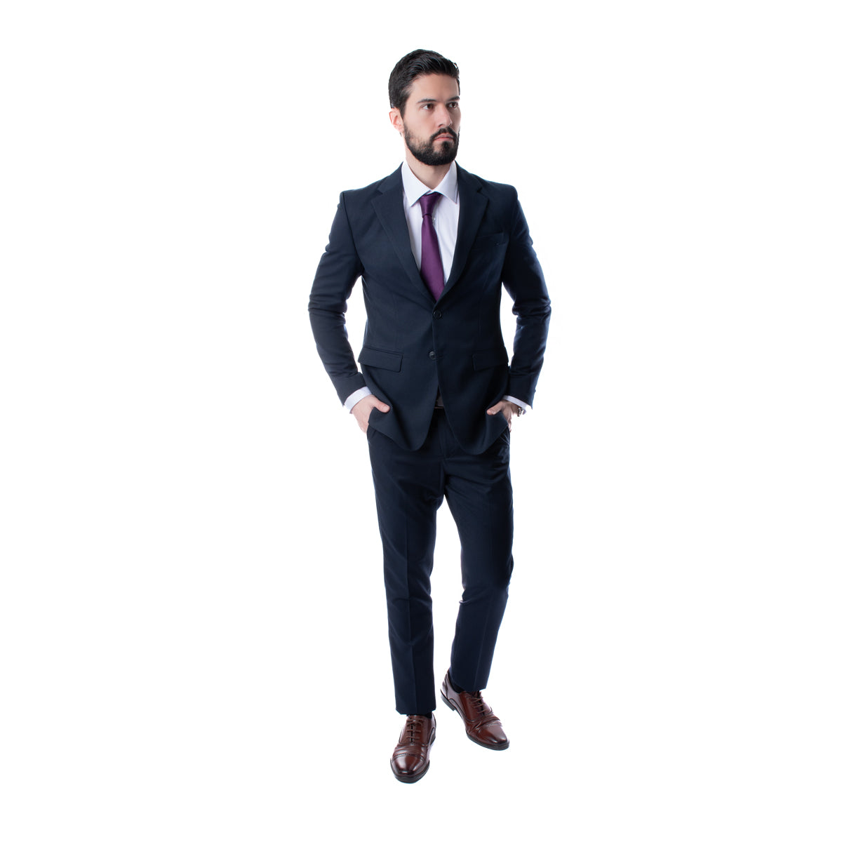 Traje de dos piezas en color azul marino; saco con solapa de muesca y dos botones; pantalón con cierre frontal de botonadura y cremallera.