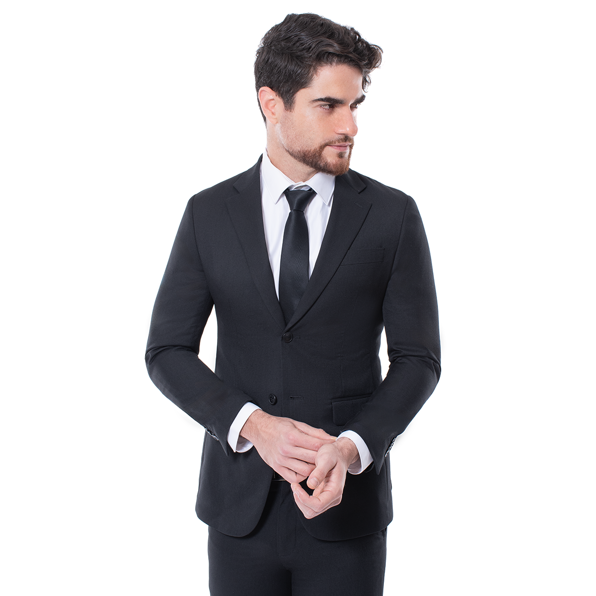 Traje para hombre en corte Classic Fit y tono negro, con acabado liso. El saco incorpora solapa de muesca y bolsillos con tapa; el conjunto incluye saco y pantalón para un look completo y coherente.